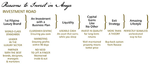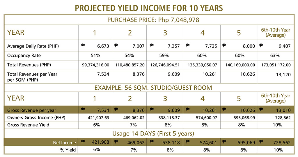 We believe in the performance of Anya, our brand partners and the Philippine resort sector, so much so that we reassure our investors with a Lease-back Guarantee over the initial five years of operations, one of our programs also offers each quarter a guaranteed income as a percentage of the purchase price, as detailed below: